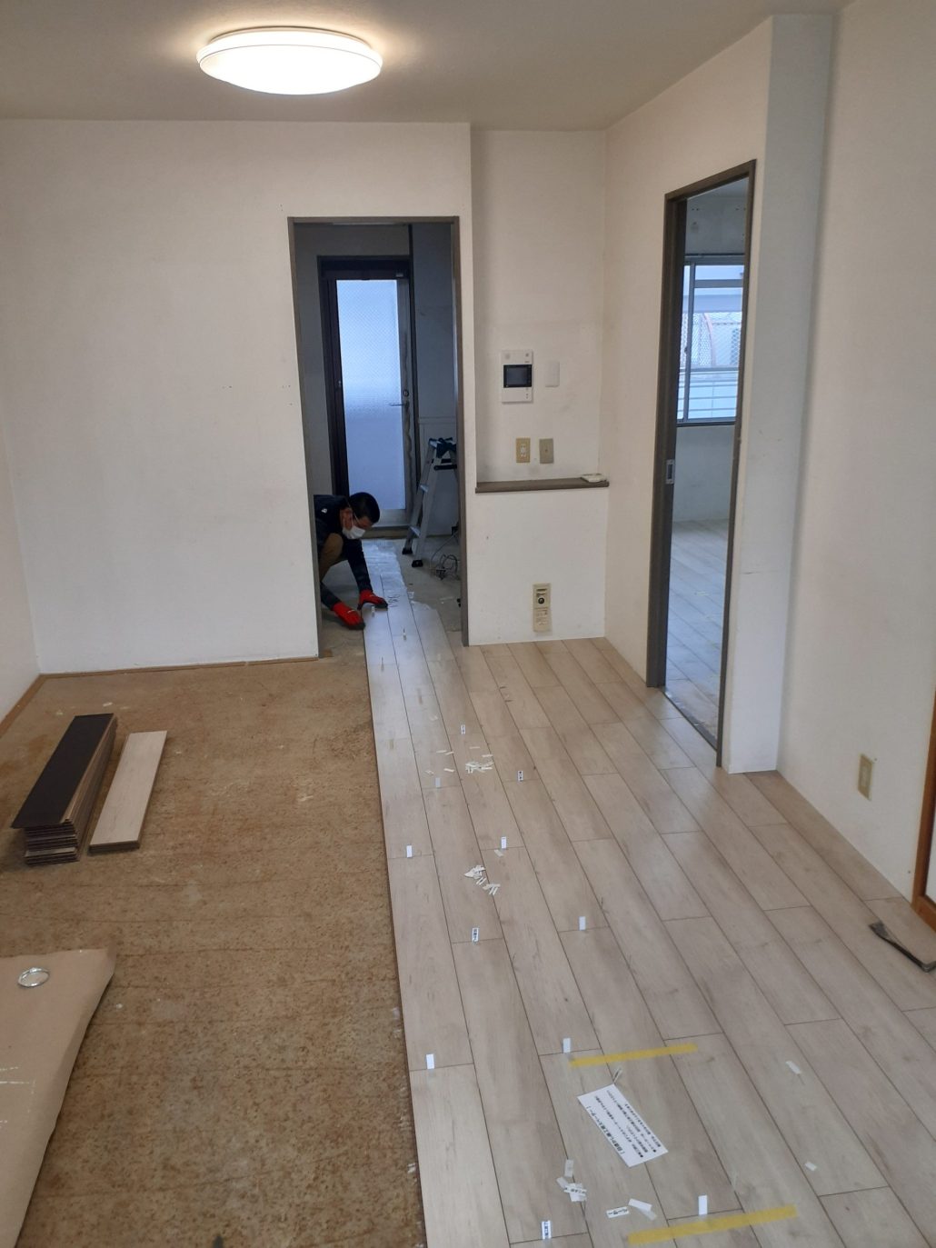 広陵町I様邸 マンション全面リフォーム工事では各部屋のカーペットを捲り、フロアを貼っています。