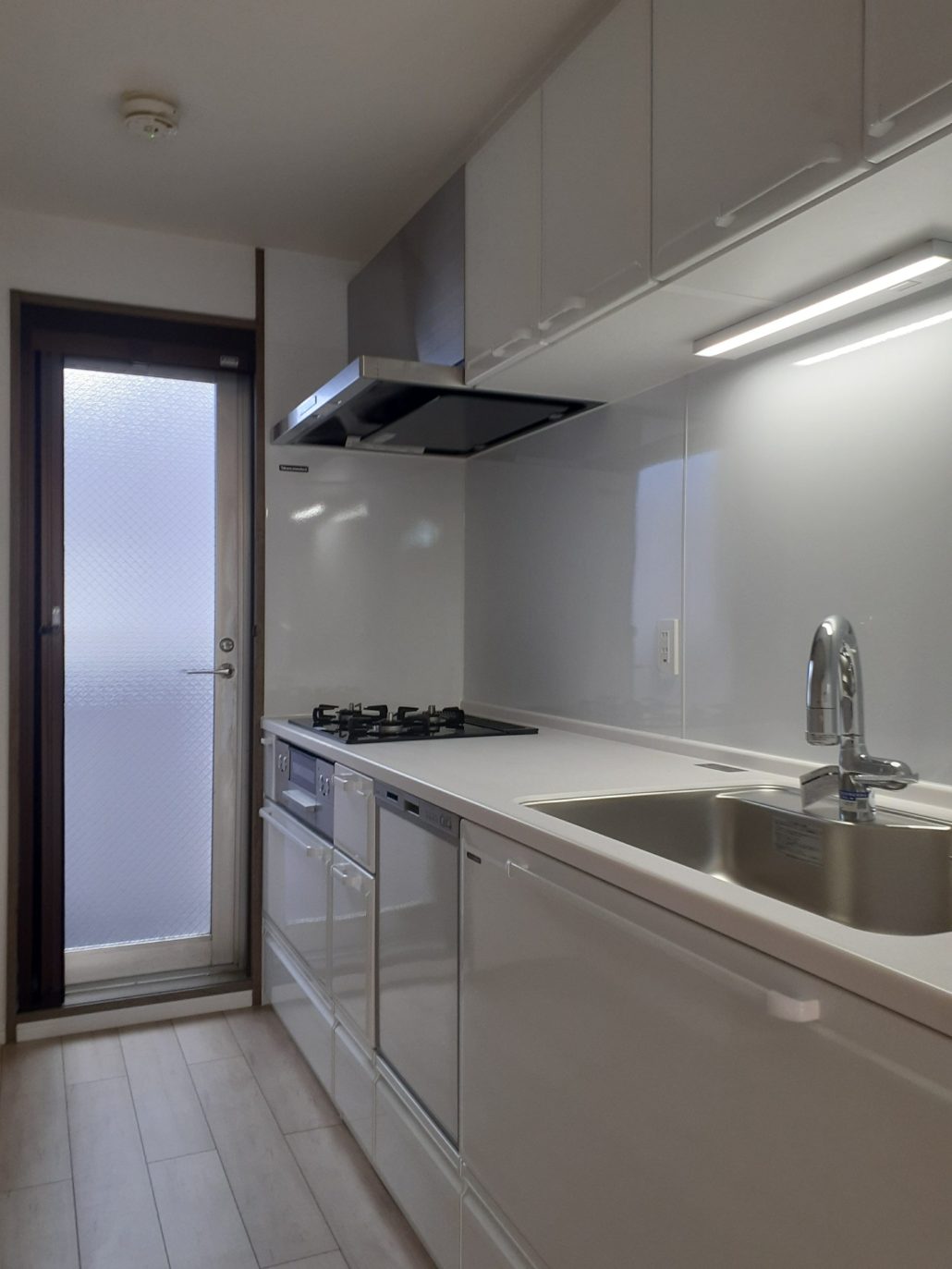 広陵町I様邸 マンション全面リフォーム工事も内装工事が終わり、キッチン、洗面台、風呂、トイレなどの設備機器の設置です。(写真はキッチン設置、完成しました)