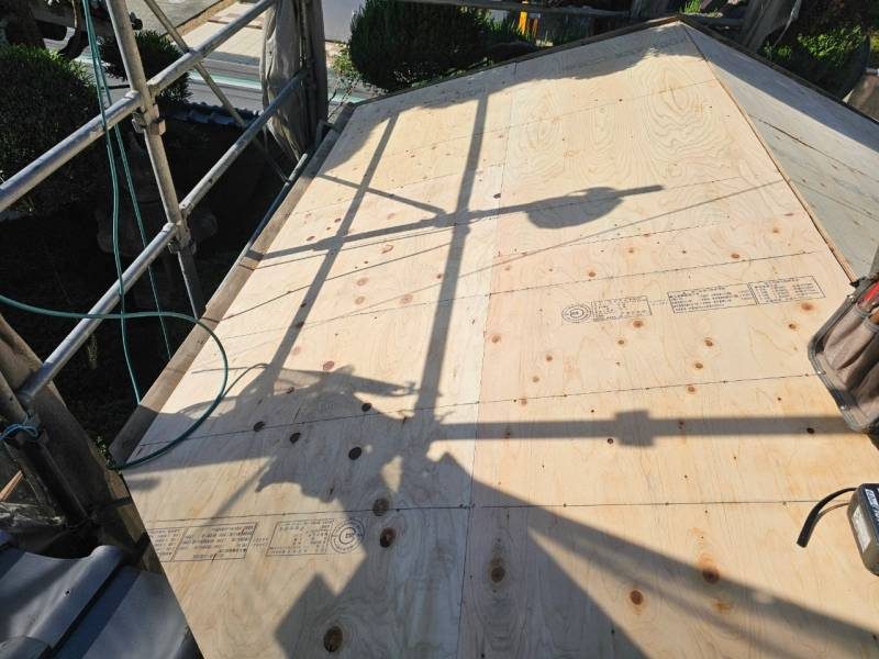 葛城市S様邸 屋根葺き替え工事で解体・撤去が終わり、下地コンパネを貼ってます