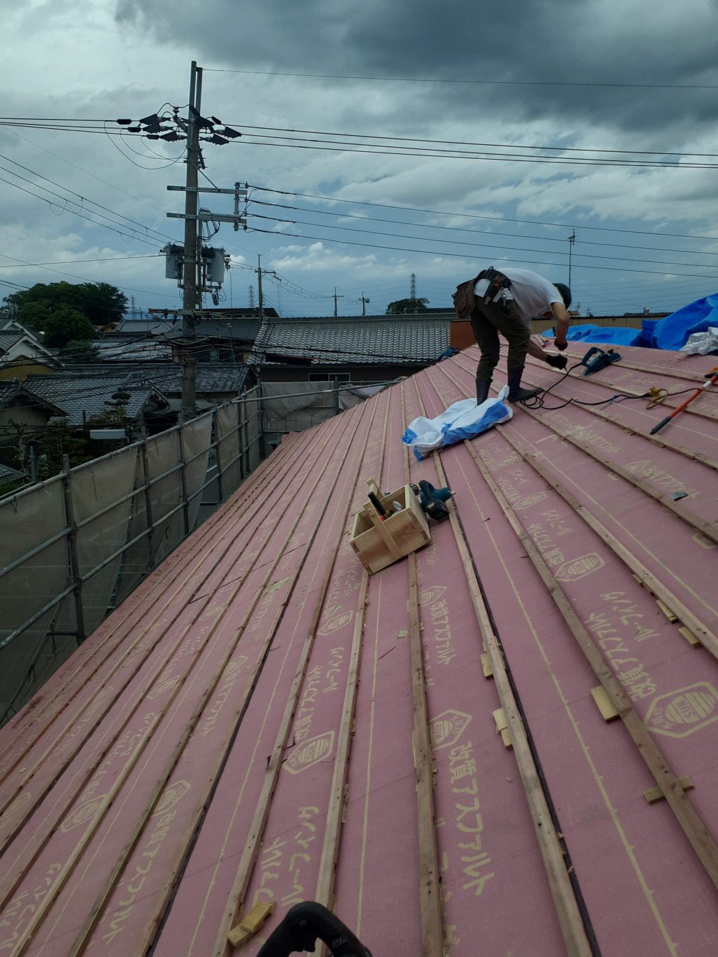 葛城市S様邸の屋根・外壁塗装工事の本屋の屋根葺き替え工事は解体後、ルーフィングを張り、不陸調整してます。