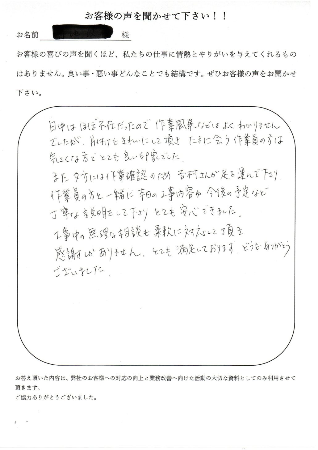 日中はほぼ不在だったので作業風景などはよくわかりませんでしたが、片付けもきれいにして頂きたまに会う作業員の方は気さくな方でとても良い印象でした。また夕方には作業確認の為吉村さんが足を運んで下さり作業員の方と一緒に本日の工事内容や今後の予定など丁寧な説明をして下さりとても安心できました。工事中の無理な相談も柔軟に対応して頂き感謝しかありません。とても満足しております。どうもありがとうございました。