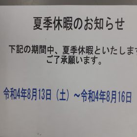 夏季休暇のお知らせ 令和4年8月13日~令和4年8月16日まで夏季休暇とさせて頂きます。
