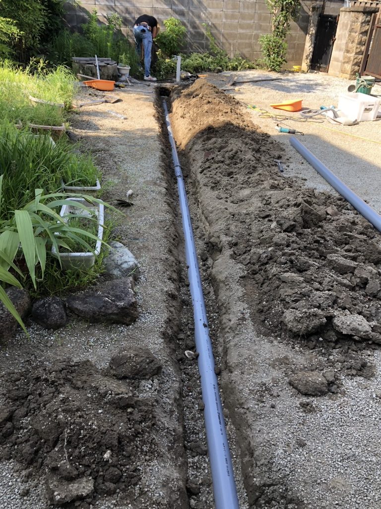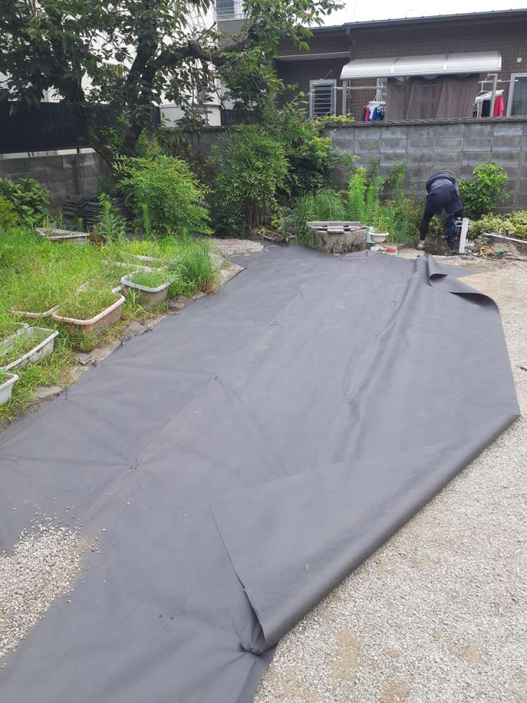 庭に水が溜まると相談を受け、高齢になり草の手入れも大変になられたので、排水処理と、防草シートを張り、水たまりを無くし草を生えないようにしました。これでこれからの時期を乗り越えれますね(^^)/