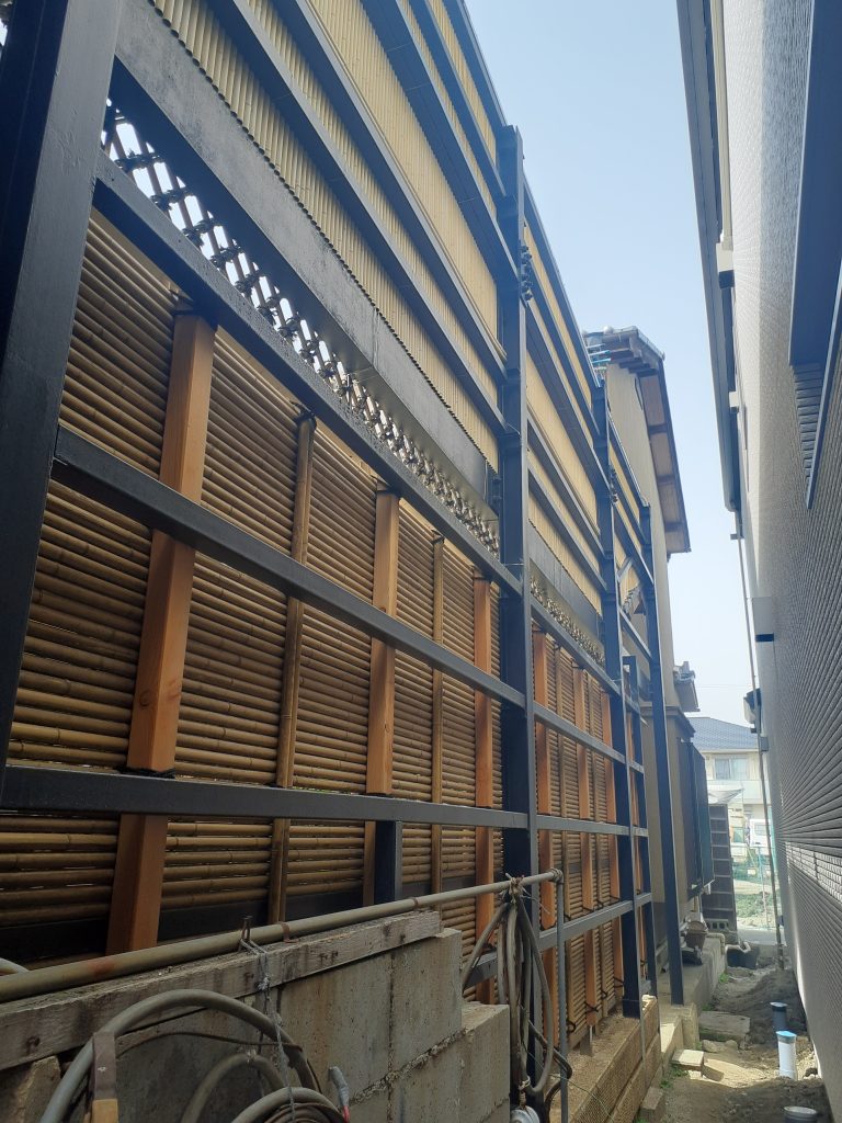 葛城市N様、工事のご依頼ありがとうございました。今回は特殊エクステリア、目隠しフェンス+鉄骨工事をさせて頂きました。隣に家が新築で建ち、既存の鉄骨で組まれた目隠しフェンスでは高さが足りず上からの目線が気になられたようで、弊社にご相談頂きました。元々ある鉄骨の基礎などがしっかりしていたので、鉄骨部分を嵩上げし、目隠しフェンス(竹調)を新たに新設しました。これで周りの目も気にせず過ごせるかと思います。