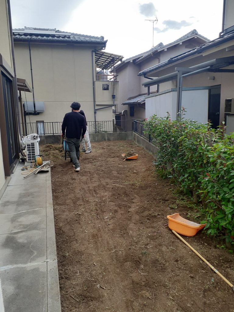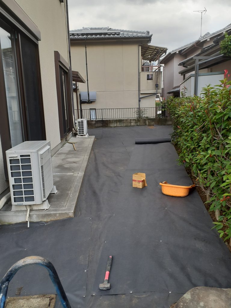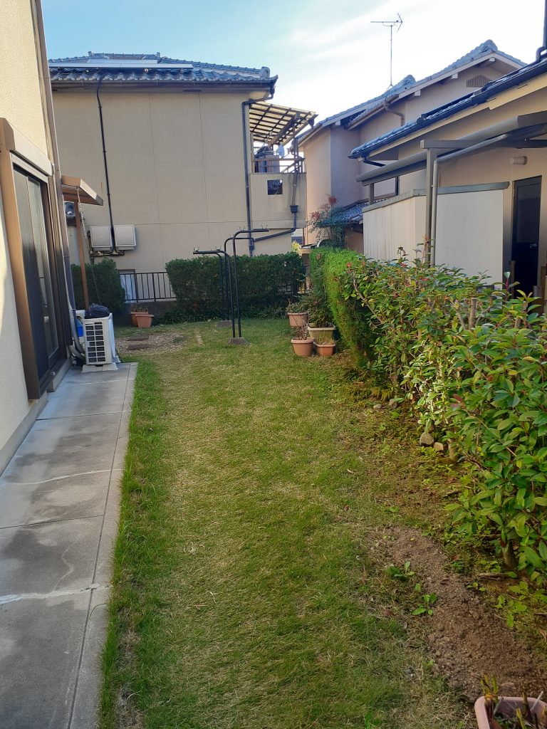 | 工事内容 | 庭 芝生 撤去後 防草シート、砂味敷き、アプローチ廻りフェンス工事、門塗装等 |